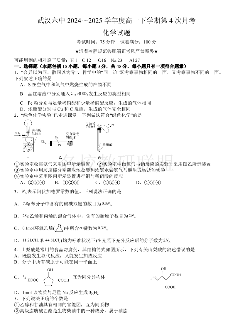 武汉六中2024-2025学年度高一下学期第四次月考 化学.pdf
