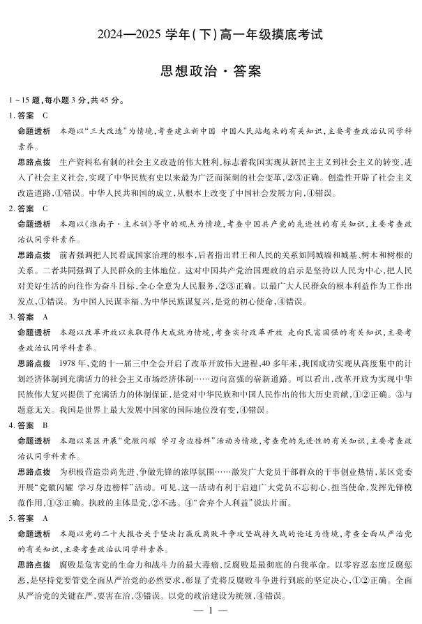 河南省天一大联考2024-2025学年(下)高一年级摸底考试 政治答案.pdf