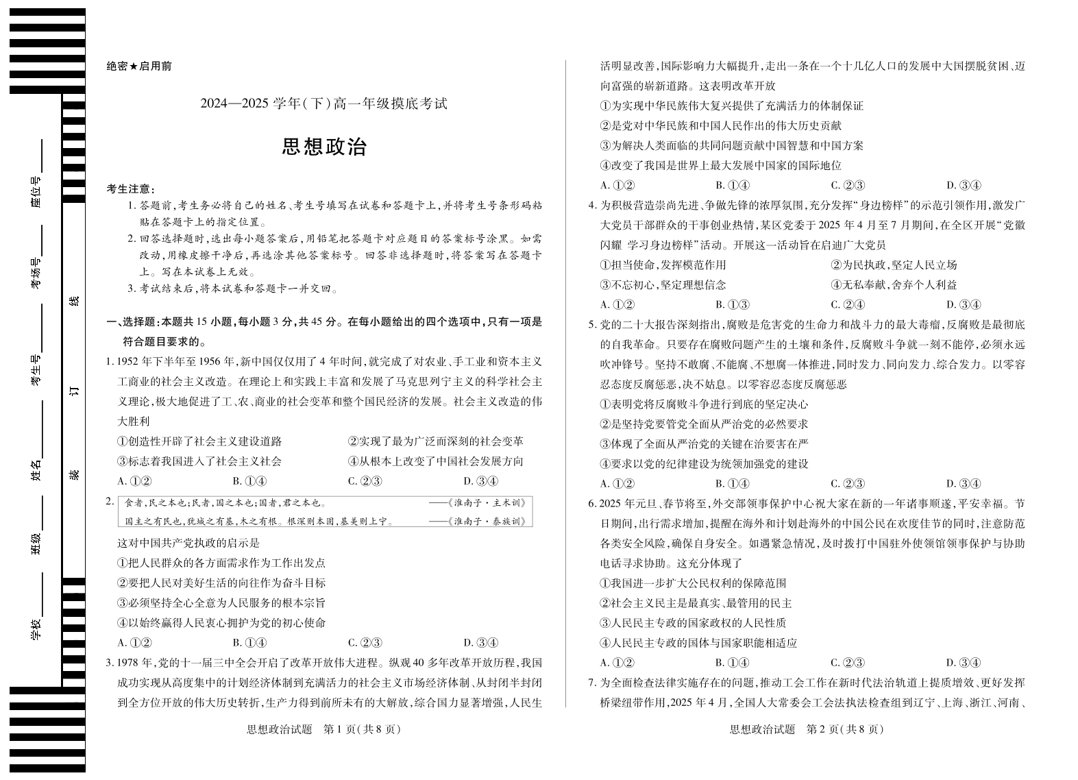 河南省天一大联考2024-2025学年(下)高一年级摸底考试 政治.pdf