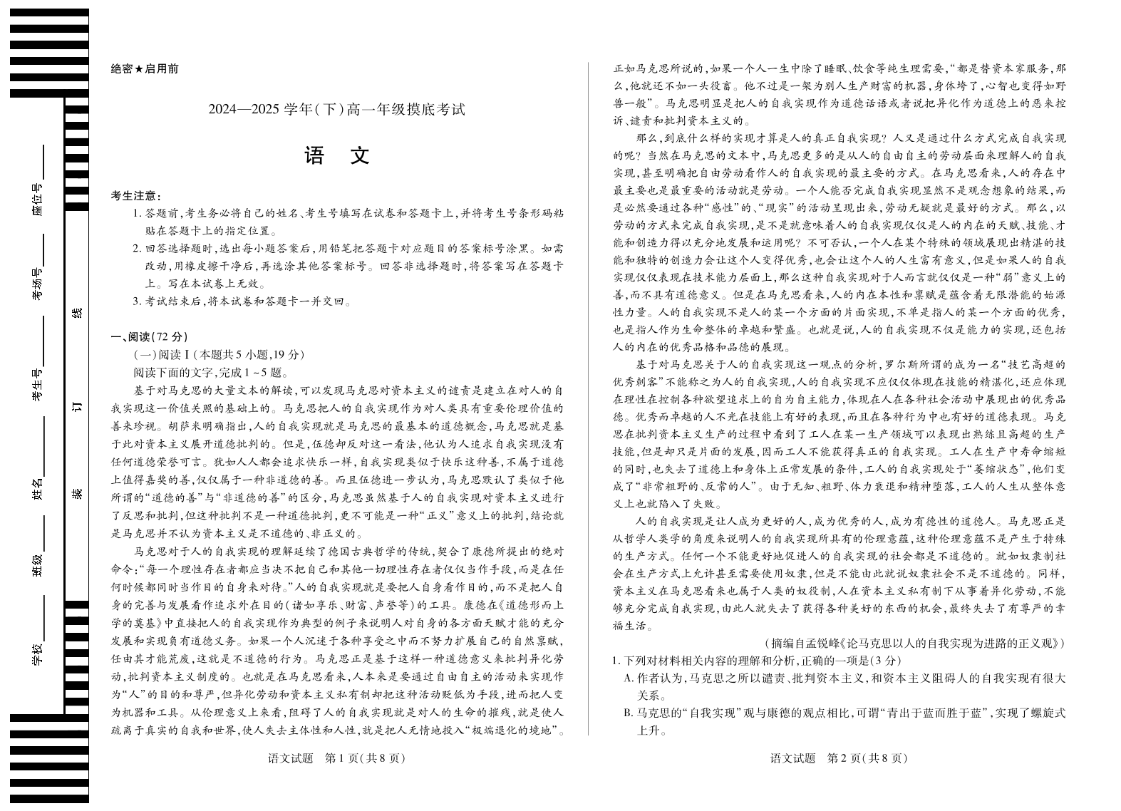 河南省天一大联考2024-2025学年(下)高一年级摸底考试 语文.pdf