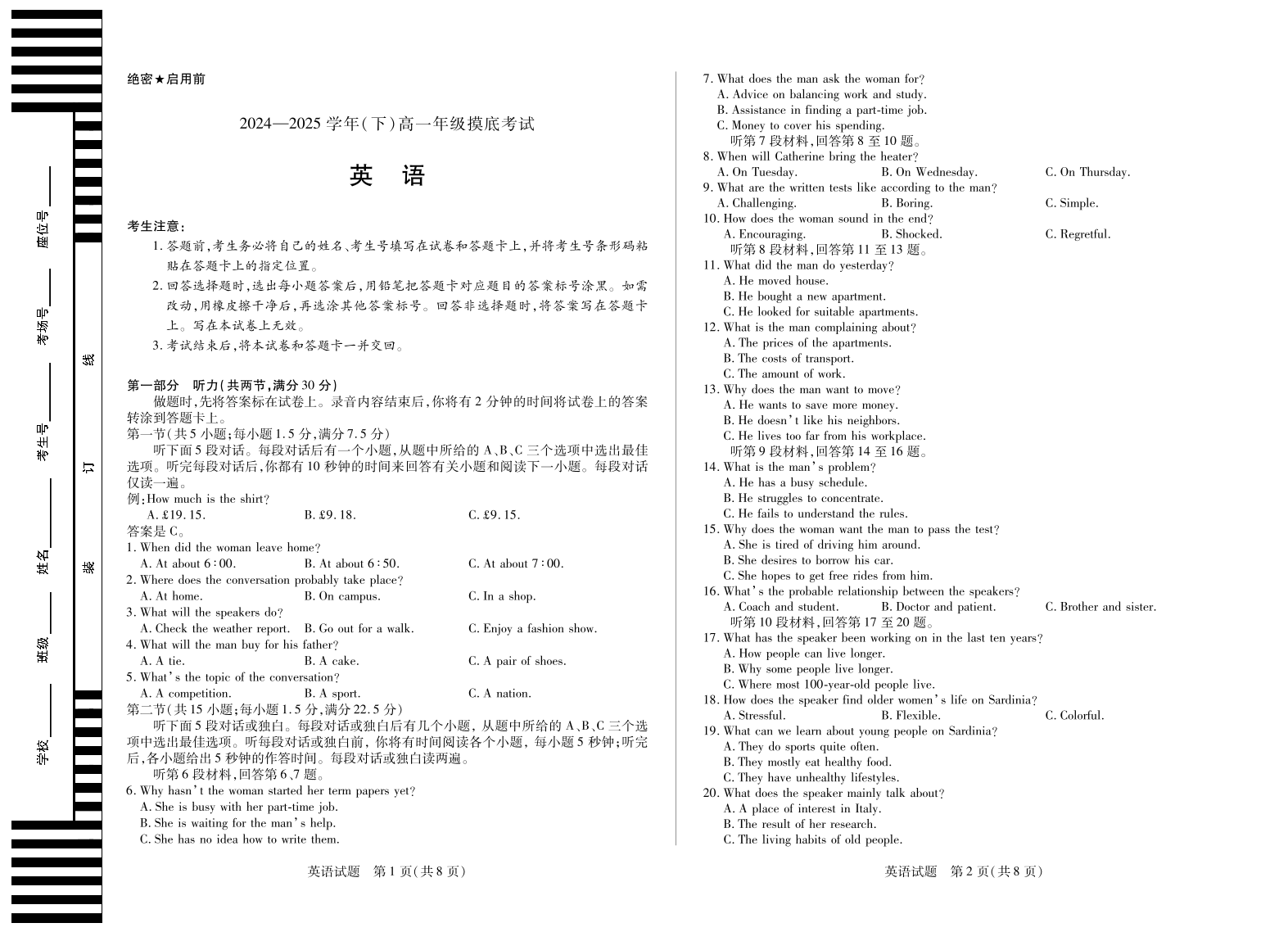 河南省天一大联考2024-2025学年(下)高一年级摸底考试 英语.pdf