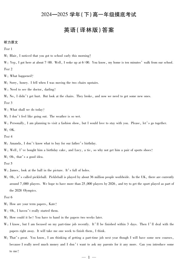 河南省天一大联考2024-2025学年(下)高一年级摸底考试 英语(译林版)答案.pdf