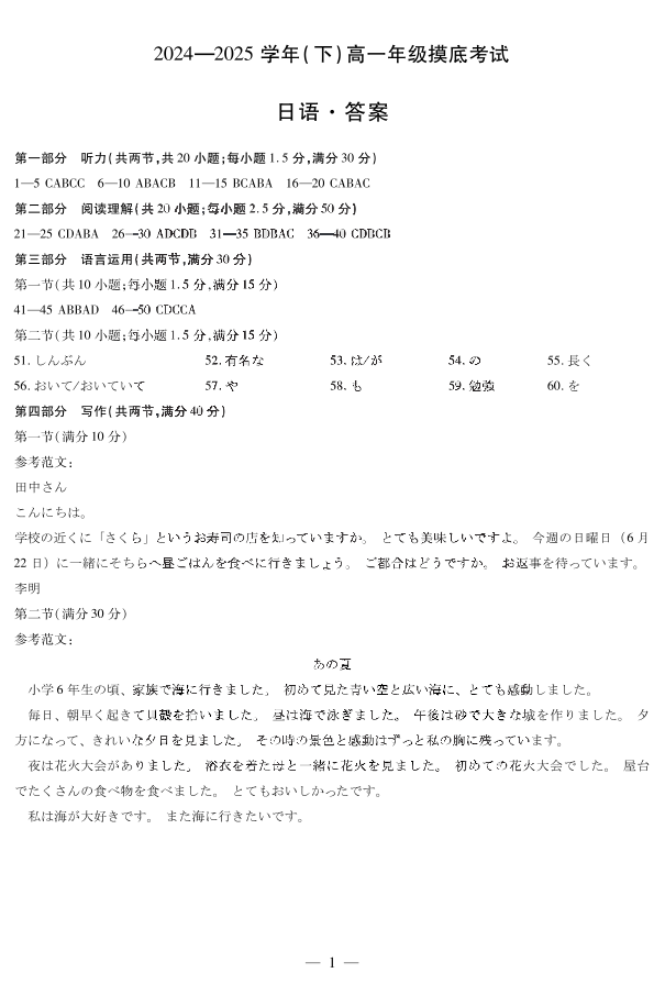 河南省天一大联考2024-2025学年(下)高一年级摸底考试 日语答案.pdf
