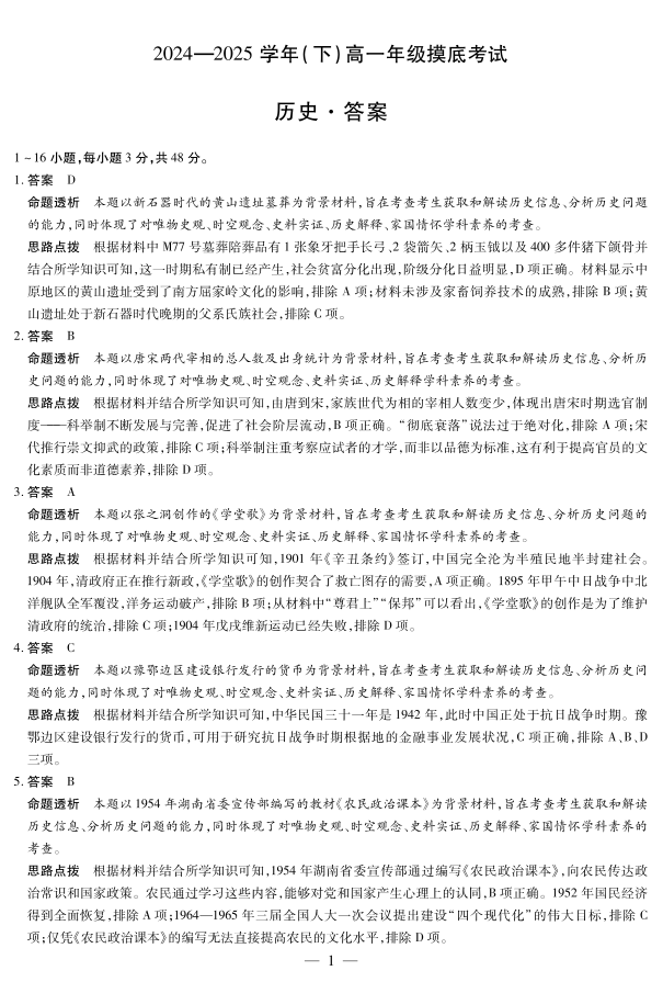 河南省天一大联考2024-2025学年(下)高一年级摸底考试 历史答案.pdf
