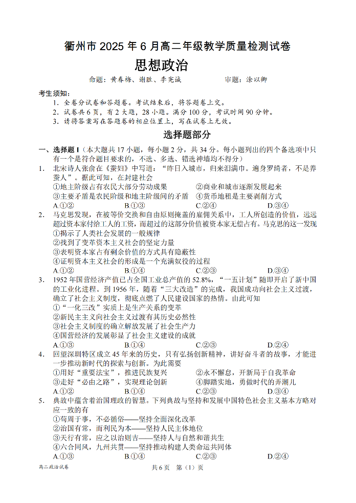 衢州市2025年6月高二年级教学质量检测 政治.pdf