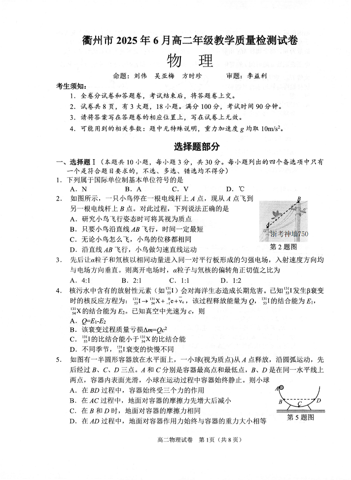 衢州市2025年6月高二年级教学质量检测 物理.pdf