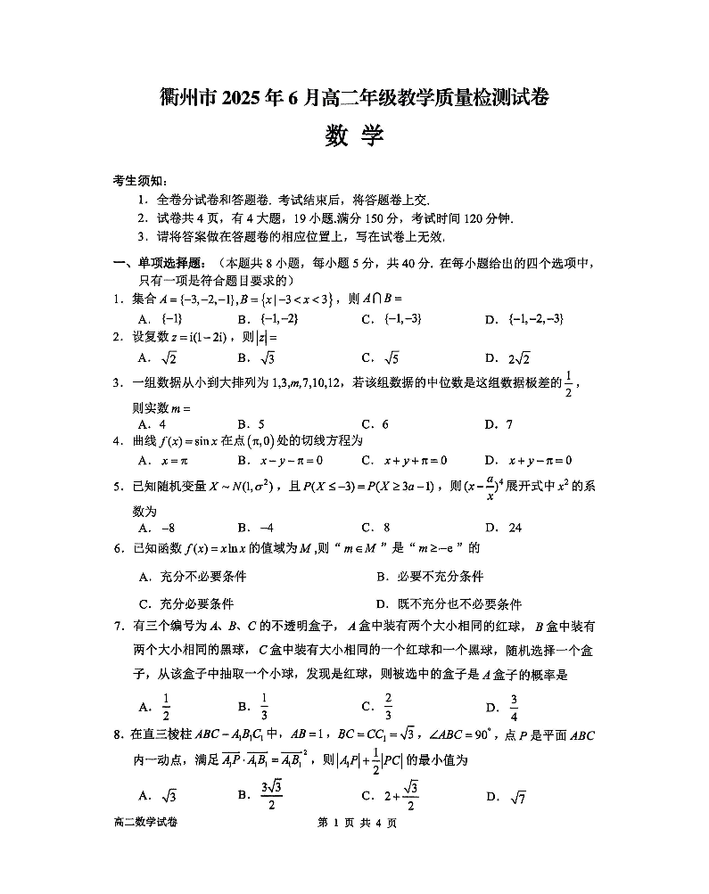 衢州市2025年6月高二年级教学质量检测 数学试卷(含答案).pdf
