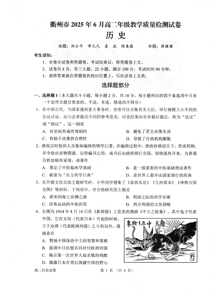 衢州市2025年6月高二年级教学质量检测 历史.pdf