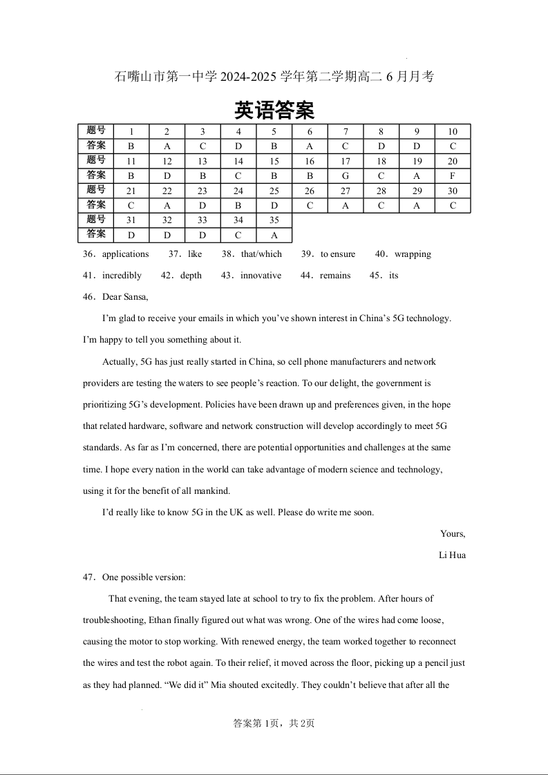 石嘴山市第一中学2024-2025学年第二学期高二6月月考 英语答案.docx