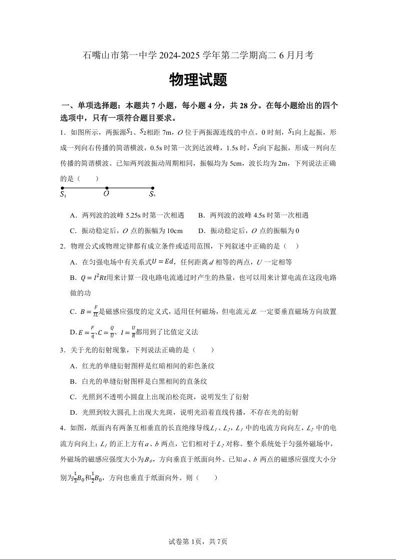 石嘴山市第一中学2024-2025学年第二学期高二6月月考 物理.docx