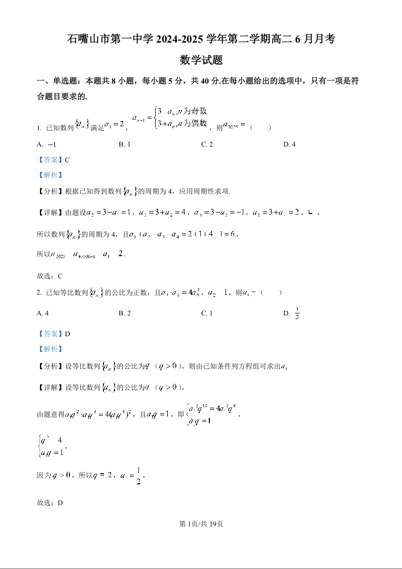石嘴山市第一中学2024-2025学年第二学期高二6月月考 数学答案.docx