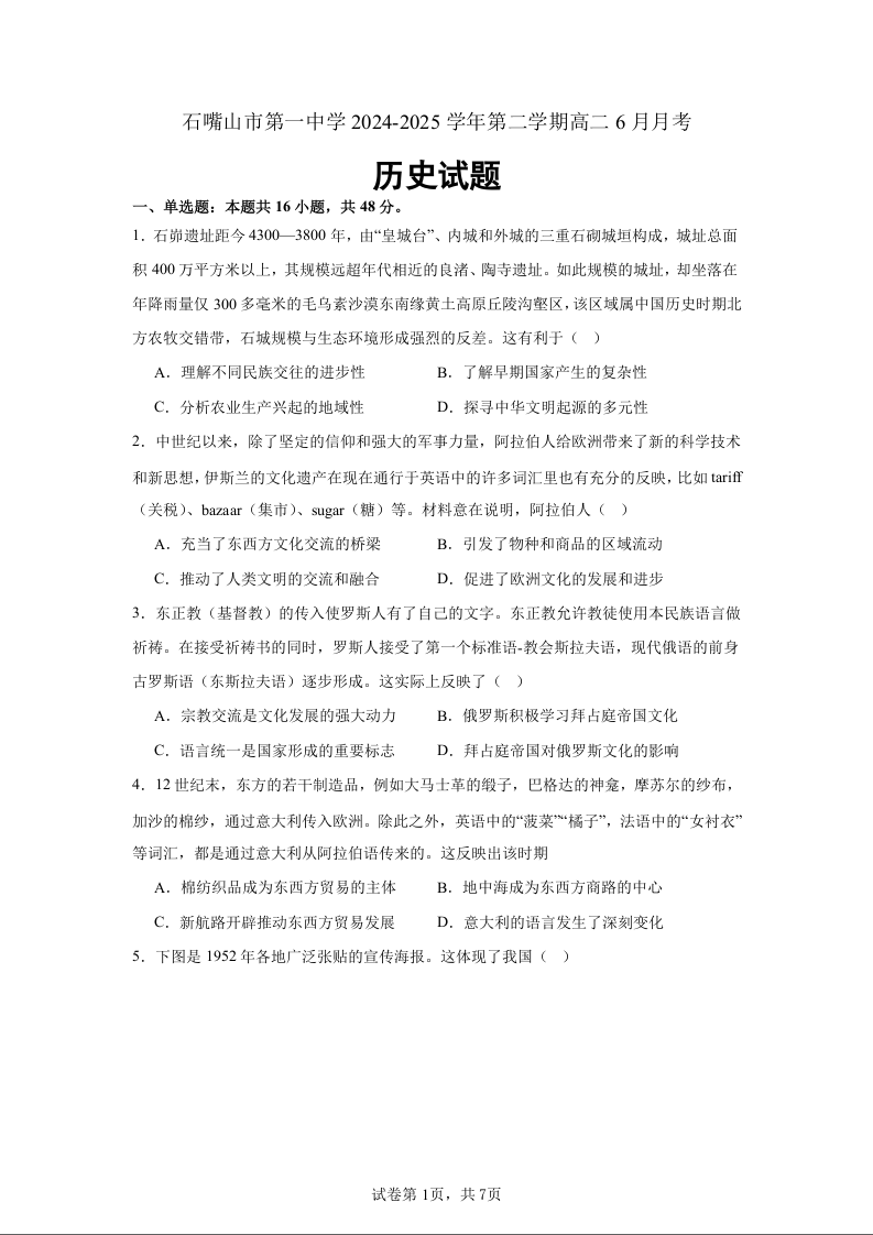 石嘴山市第一中学2024-2025学年第二学期高二6月月考 历史.docx