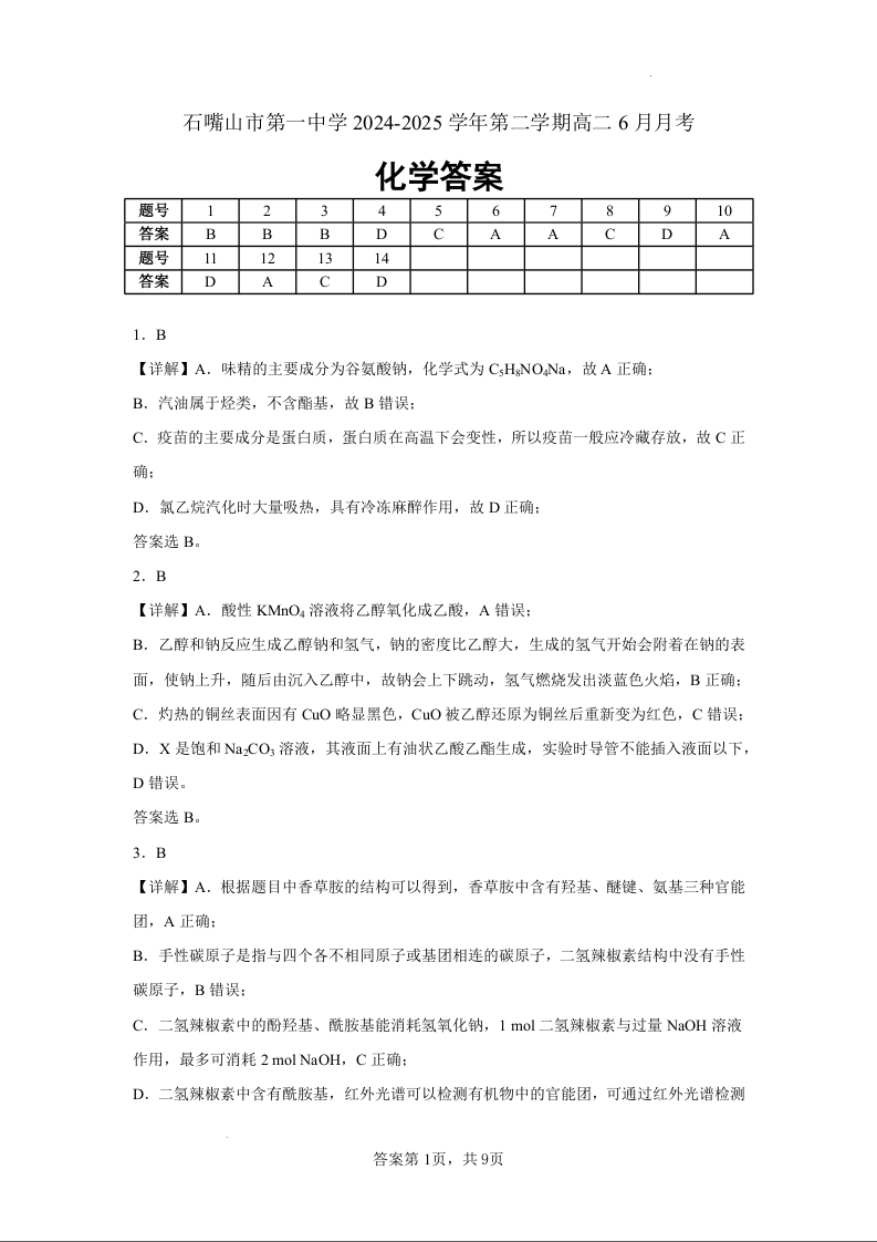 石嘴山市第一中学2024-2025学年第二学期高二6月月考 化学答案.docx