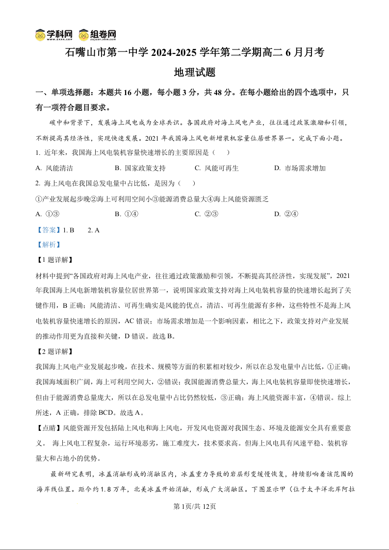 石嘴山市第一中学2024-2025学年第二学期高二6月月考 地理答案.docx