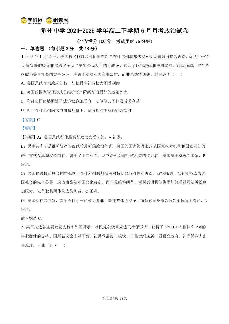 荆州中学2024-2025学年高二下学期6月月考 政治答案.docx
