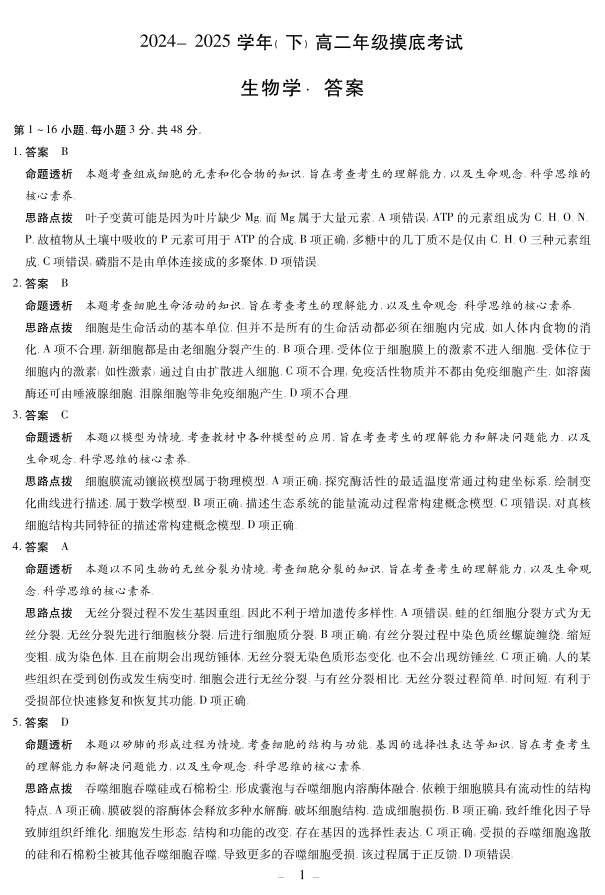 河南省天一大联考2024-2025学年(下)高二年级摸底考试 生物答案.pdf