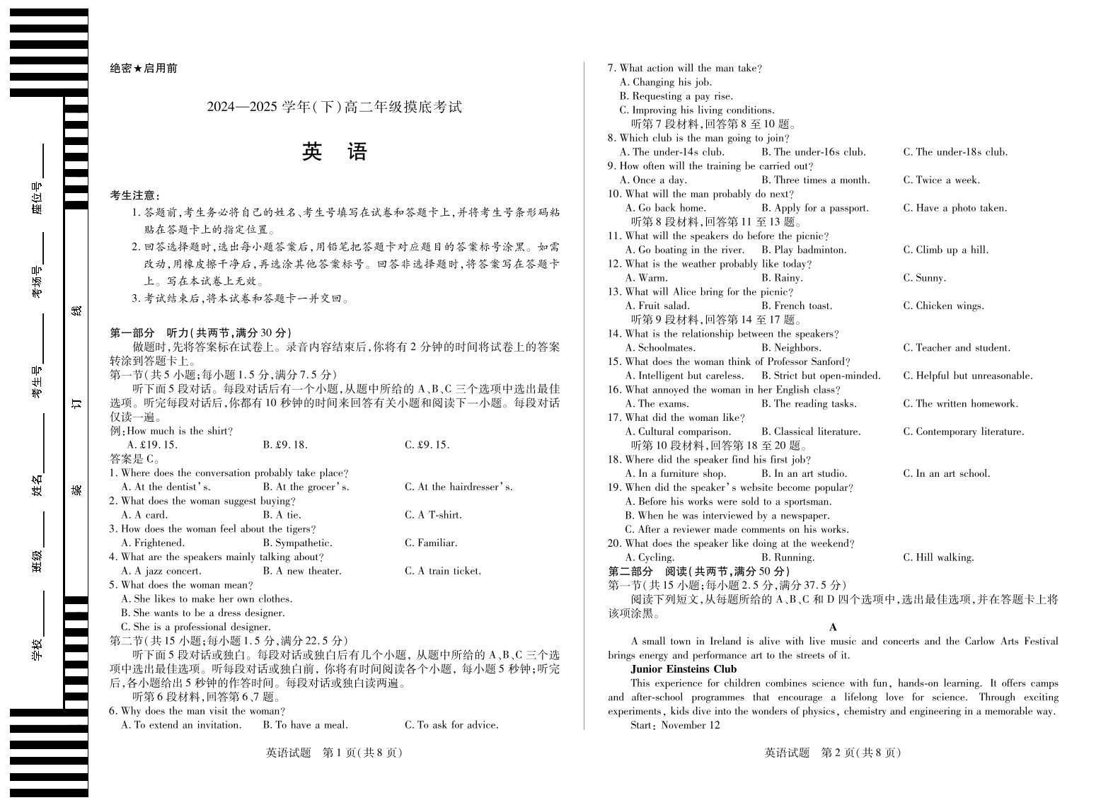 安徽省天一大联考2024-2025学年(下)高二年级摸底考试 英语.pdf