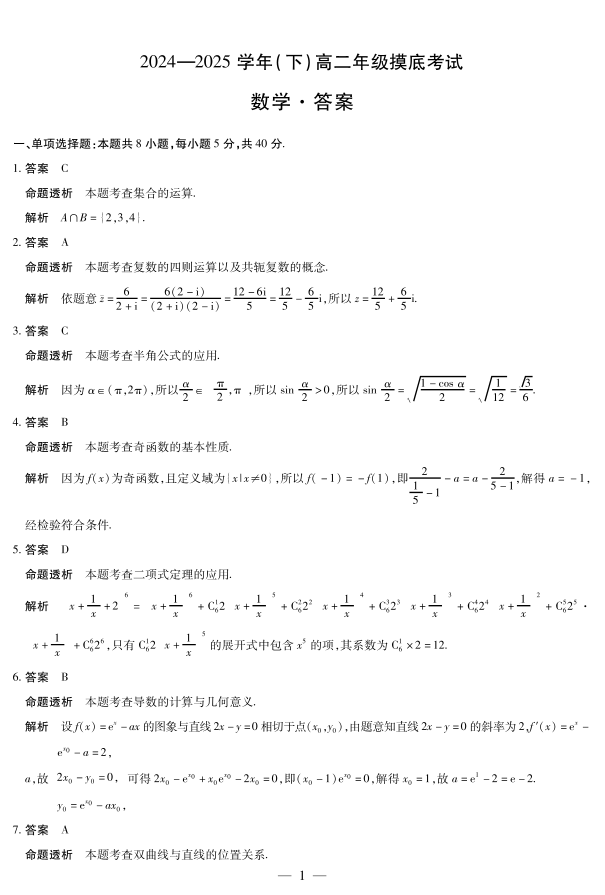 安徽省天一大联考2024-2025学年(下)高二年级摸底考试 数学答案.pdf