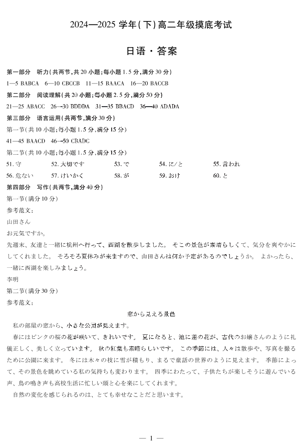安徽省天一大联考2024-2025学年(下)高二年级摸底考试 日语答案.pdf