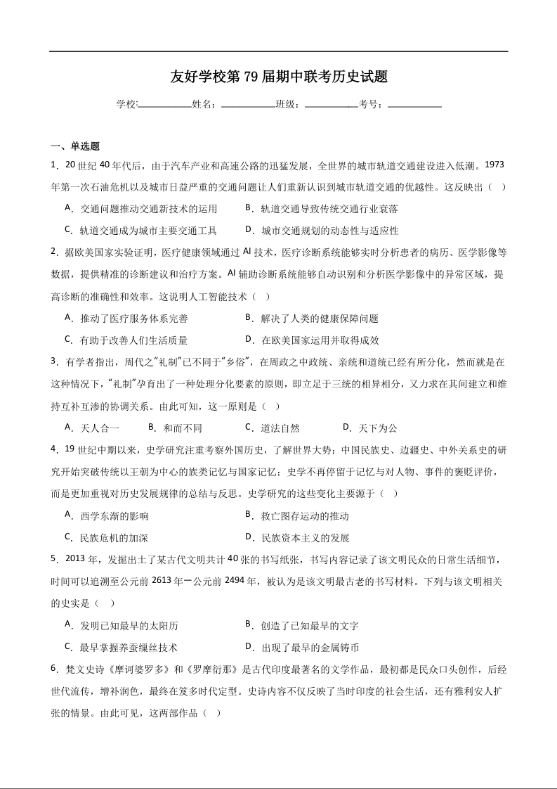 吉林省友好学校2024-2025学年高二下学期第79届期中联考 历史试卷(含答案).docx