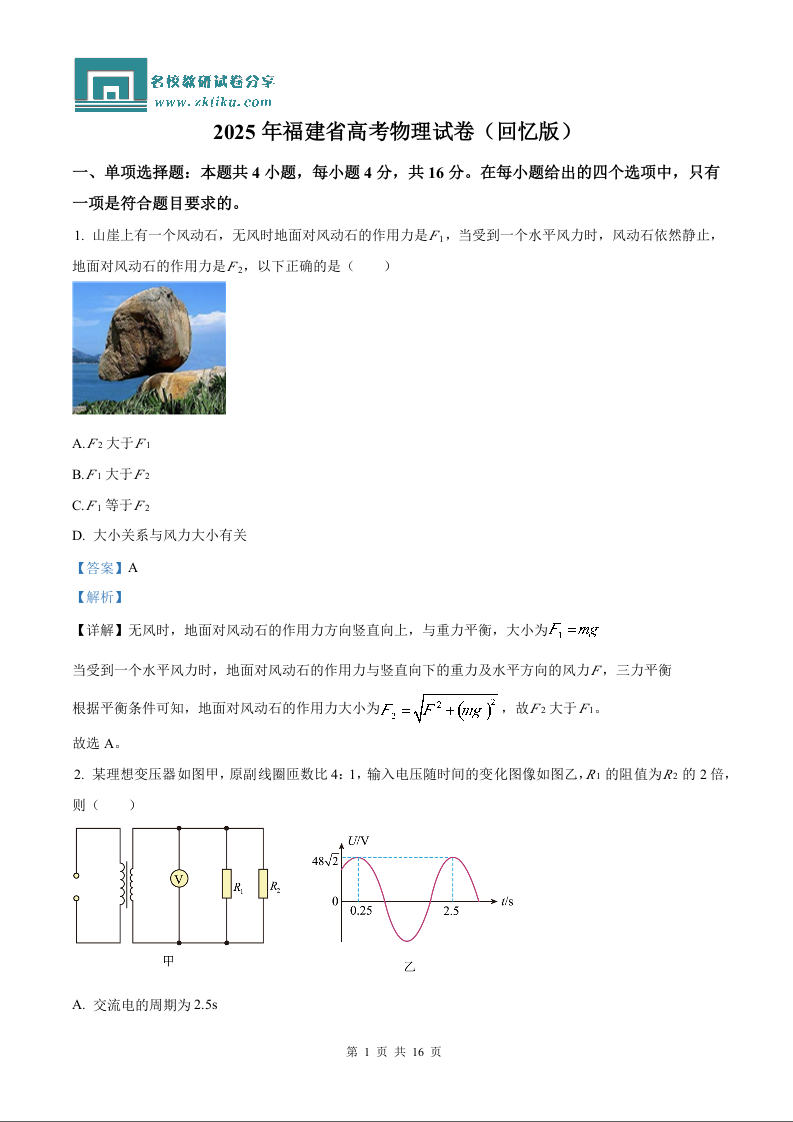 2025年高考福建卷物理部分真题(含解析).docx