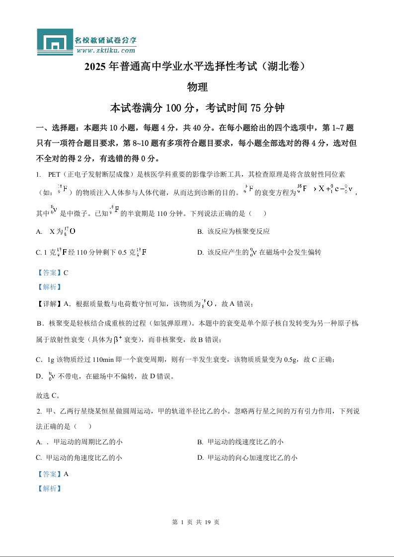 2025年高考湖北卷物理真题(含解析).docx