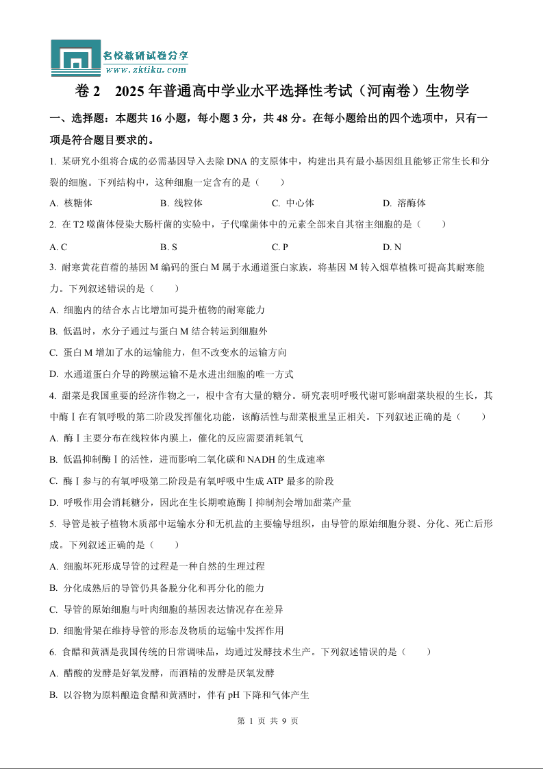 2025年高考河南卷生物真题.docx