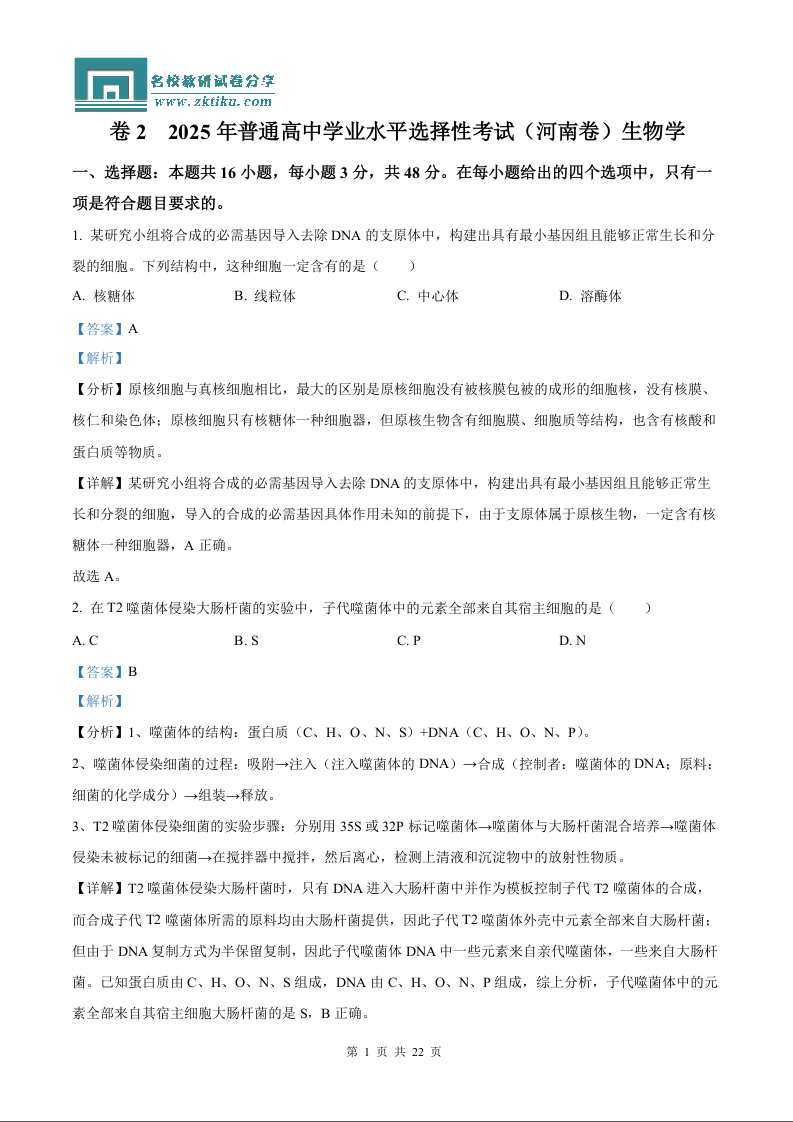 2025年高考河南卷生物真题(含解析).docx