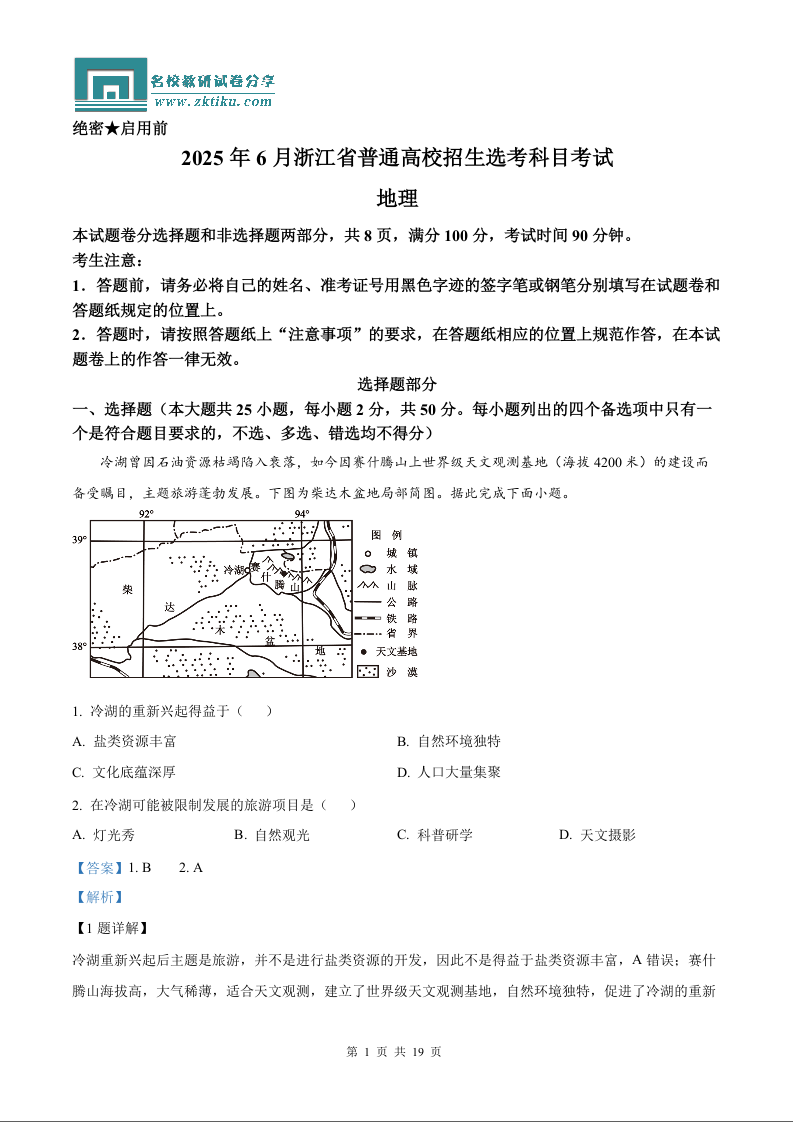 2025年浙江6月高考地理真题(含解析).docx