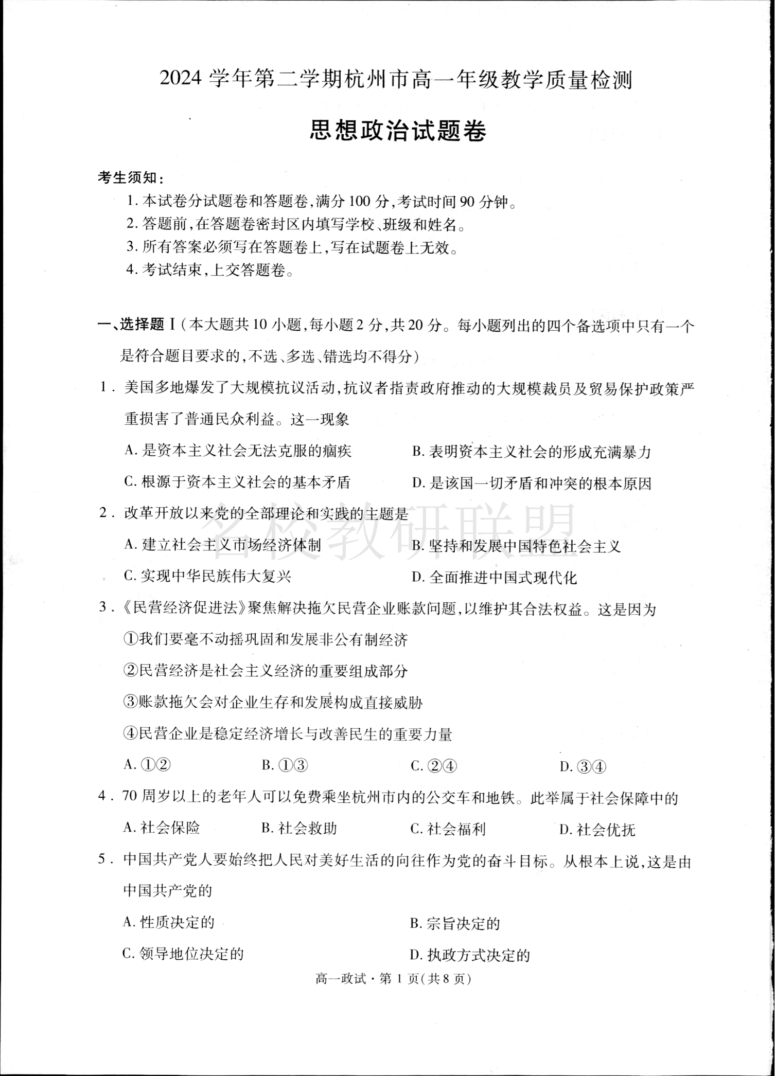 2024学年第二学期杭州市高一年级教学质量检测 政治.pdf