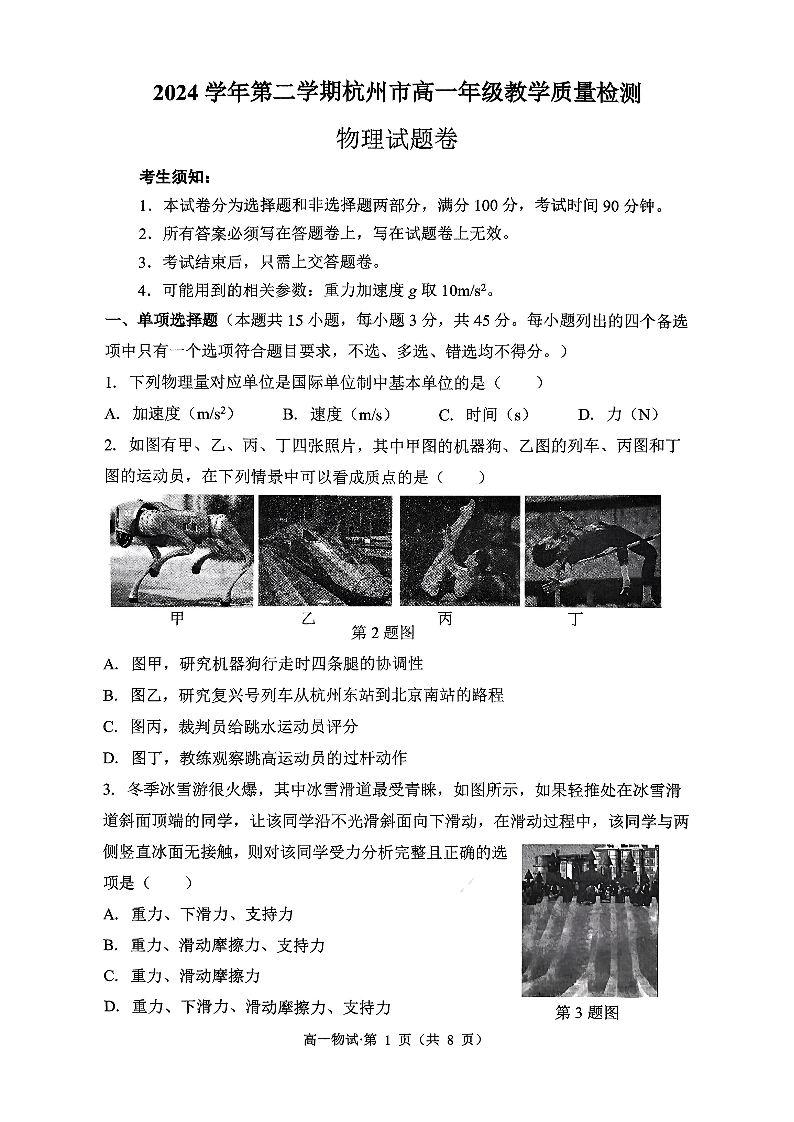 2024学年第二学期杭州市高一年级教学质量检测 物理.pdf
