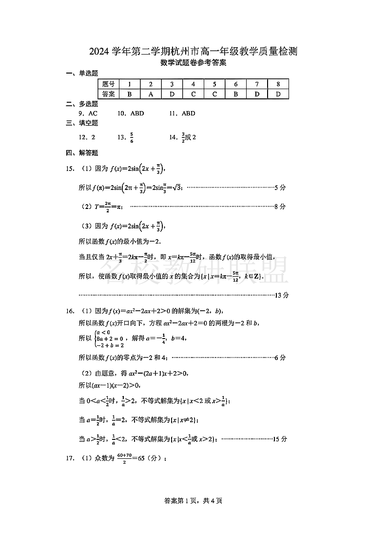 2024学年第二学期杭州市高一年级教学质量检测 数学答案.pdf