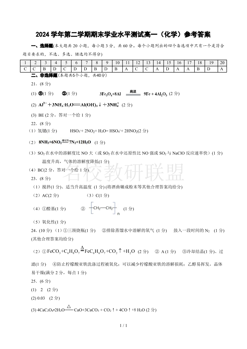 2024学年第二学期杭州市高一年级教学质量检测 化学答案.pdf