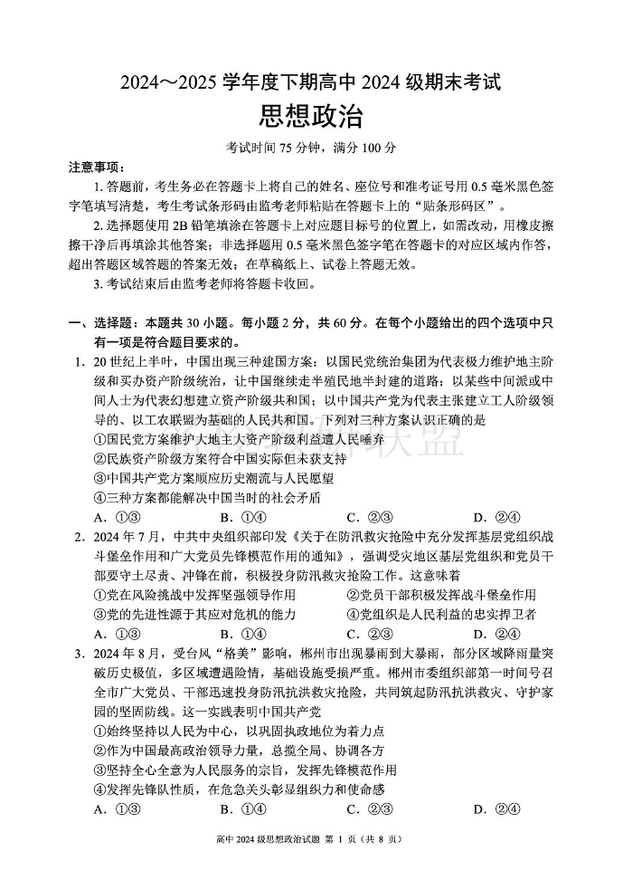 2024~2025学年度下期高中2024级期末考试 政治.pdf