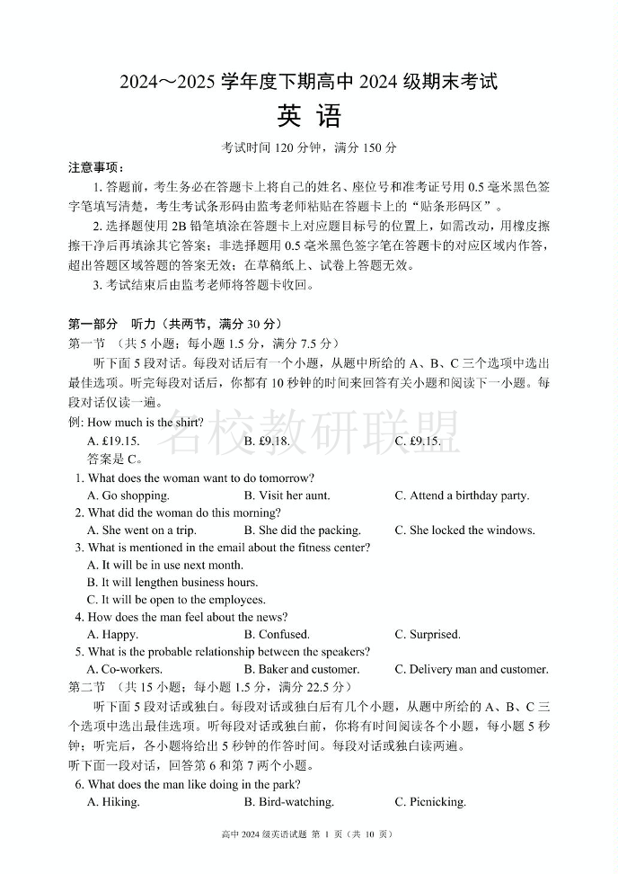 2024~2025学年度下期高中2024级期末考试 英语.pdf