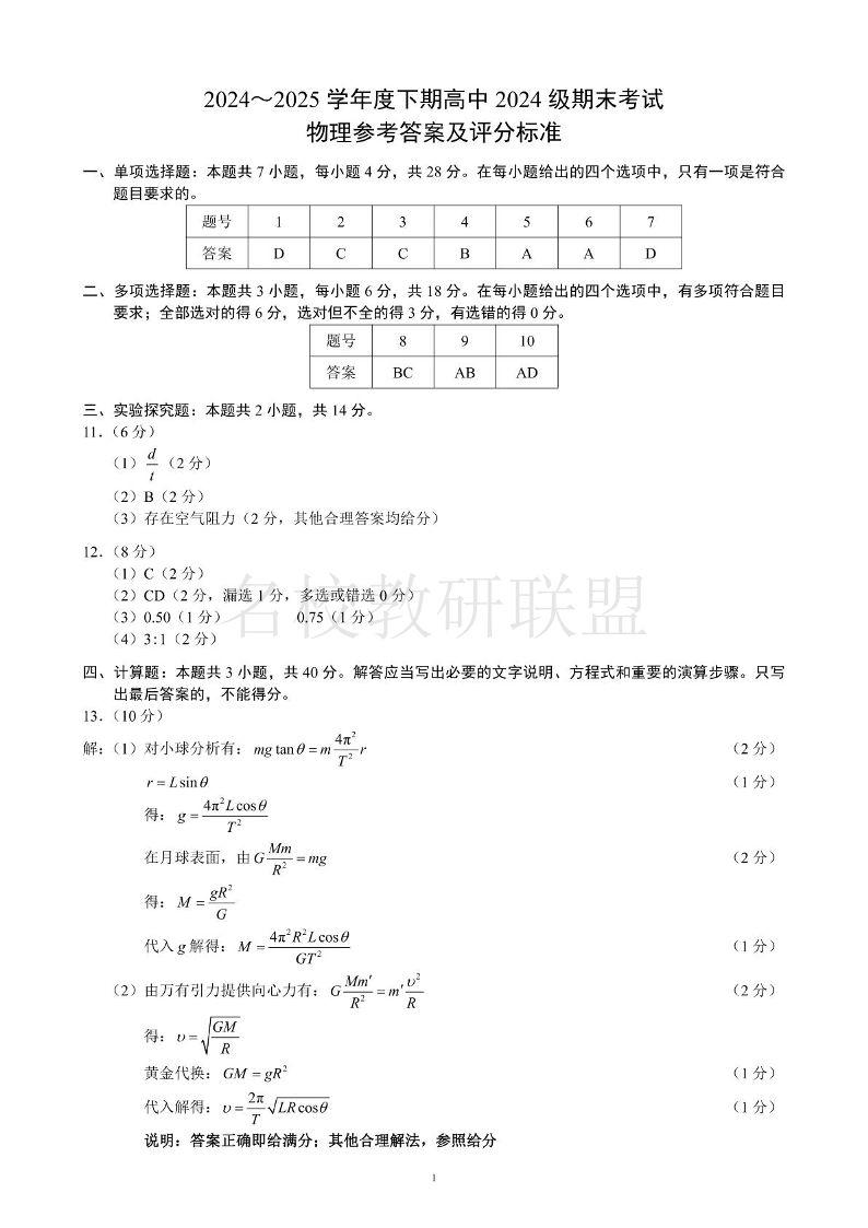 2024~2025学年度下期高中2024级期末考试 物理答案.pdf