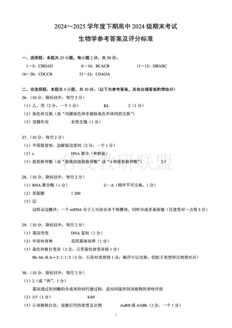 2024~2025学年度下期高中2024级期末考试 生物答案.pdf