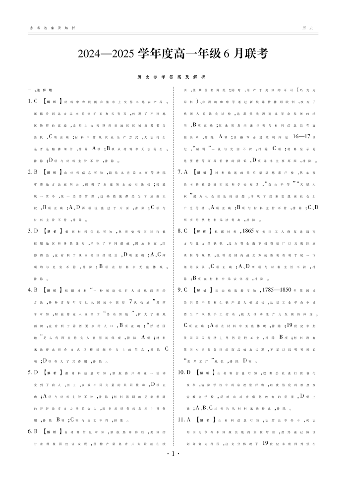 高一历史答案(2024一2025学年度高一年级6月联考).pdf