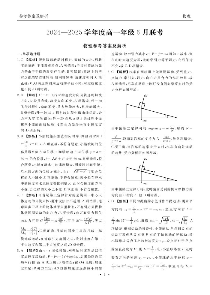 高一物理答案(2024一2025学年度高一年级6月联考).pdf