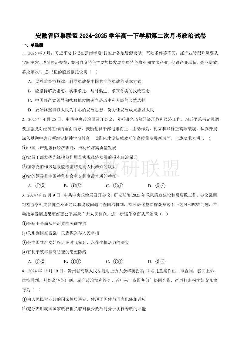 安徽省庐巢联盟2024-2025学年高一下学期第二次集中练习 政治(含答案).pdf
