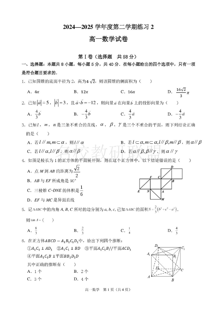 安徽省庐巢联盟2024-2025学年高一下学期第二次集中练习 数学(含答案).pdf