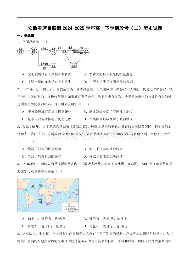 安徽省庐巢联盟2024-2025学年高一下学期第二次集中练习 历史(含答案).pdf