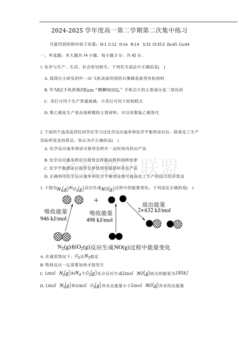 安徽省庐巢联盟2024-2025学年高一下学期第二次集中练习 化学(含答案).pdf