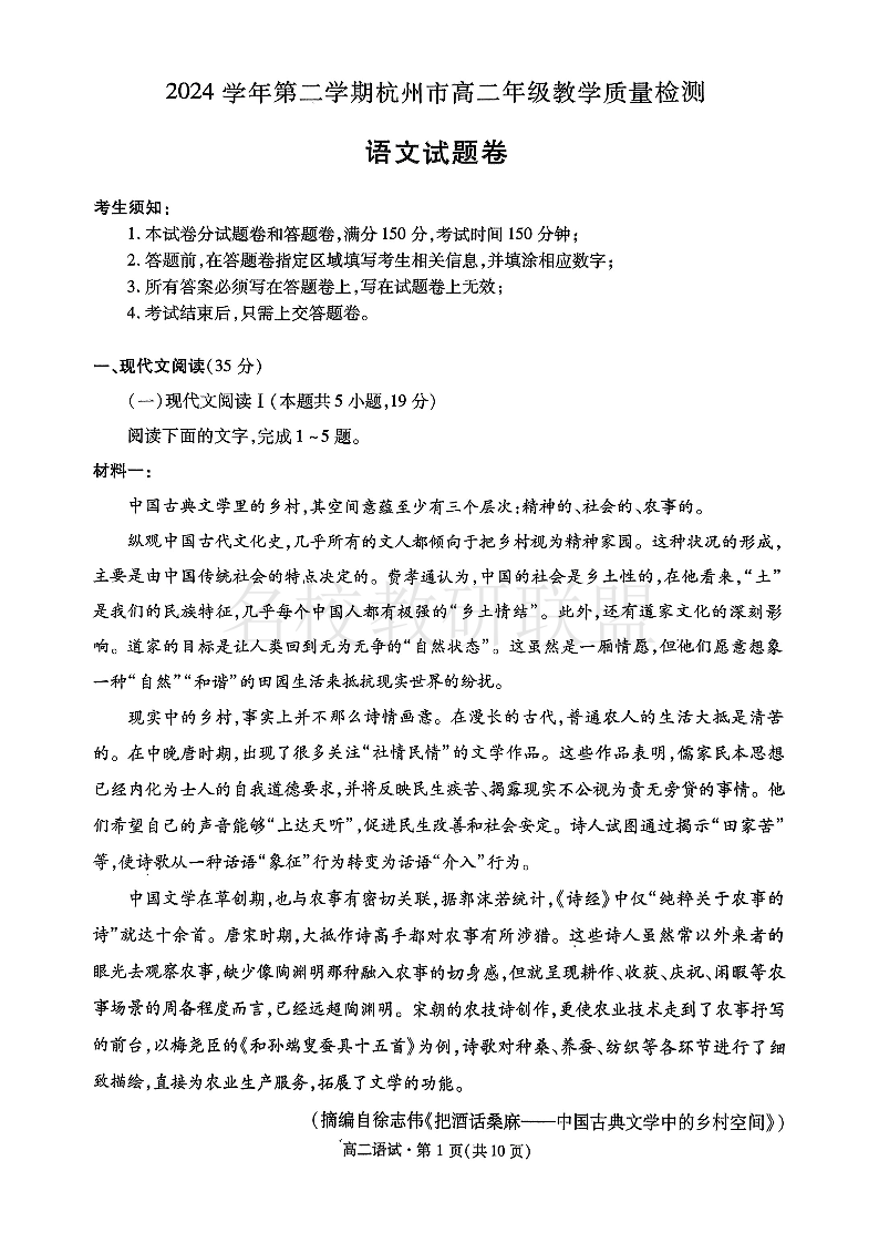 2024学年第二学期杭州市高二年级教学质量检测 语文.pdf