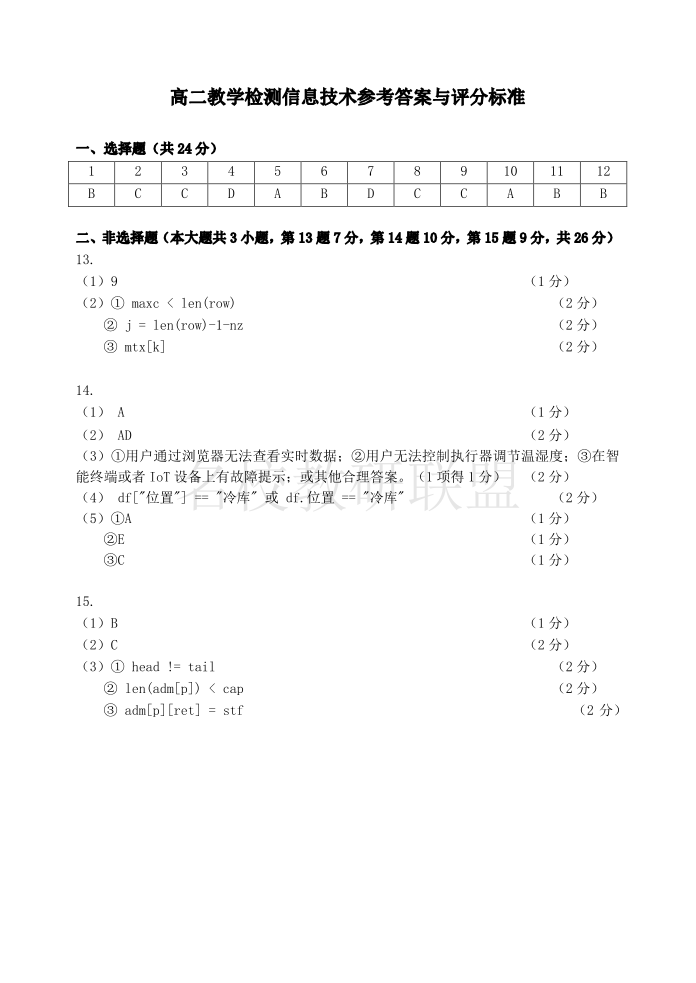 2024学年第二学期杭州市高二年级教学质量检测 技术信息答案.pdf