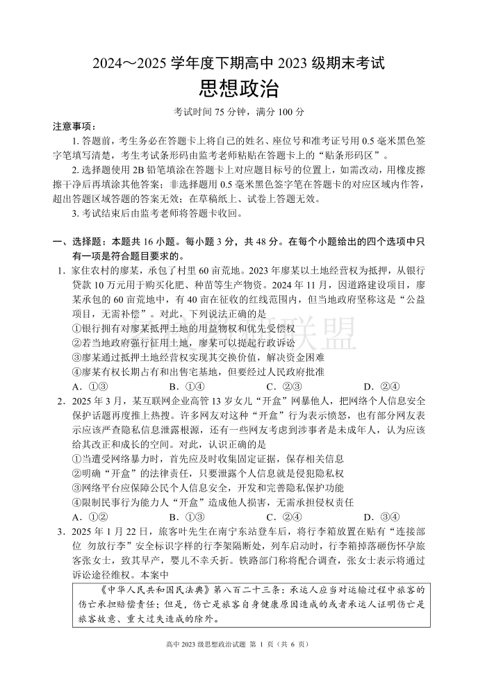 2024~2025学年度下期高中2023级期末考试 政治.pdf