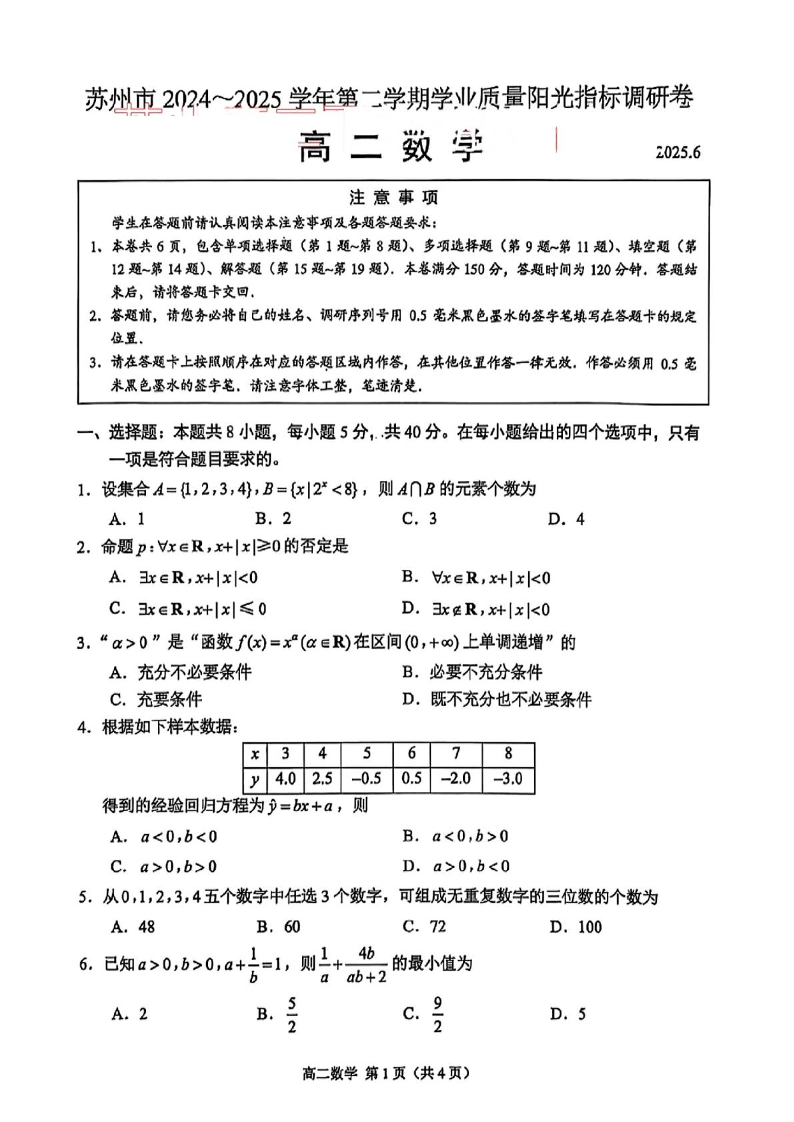 苏州市2024-2025学年高二下学期学业质量阳光指标调研 数学试卷(含答案).pdf