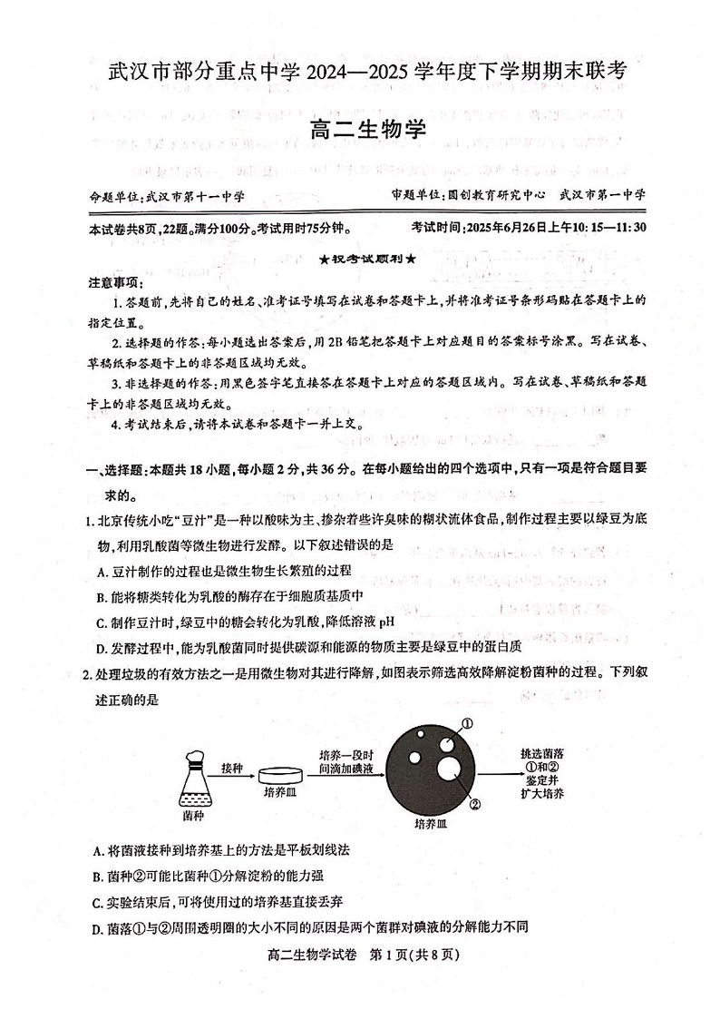 武汉市部分重点中学2024-2025学年高二下学期期末联考 生物试卷(含答案).pdf