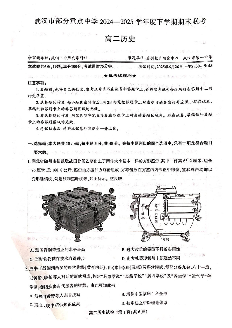 武汉市部分重点中学2024-2025学年高二下学期期末联考 历史试卷(含答案).pdf