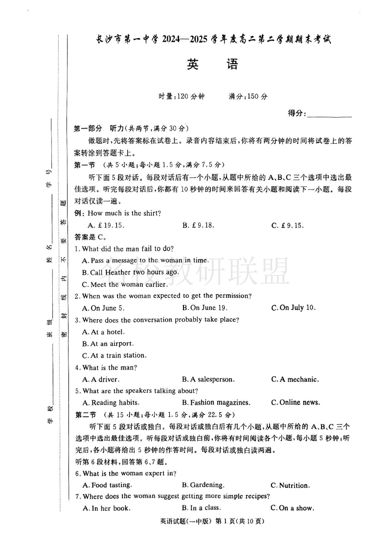 长沙市第一中学2024-2025学年度高二第二学期期末考试 英语试题(含答案).pdf
